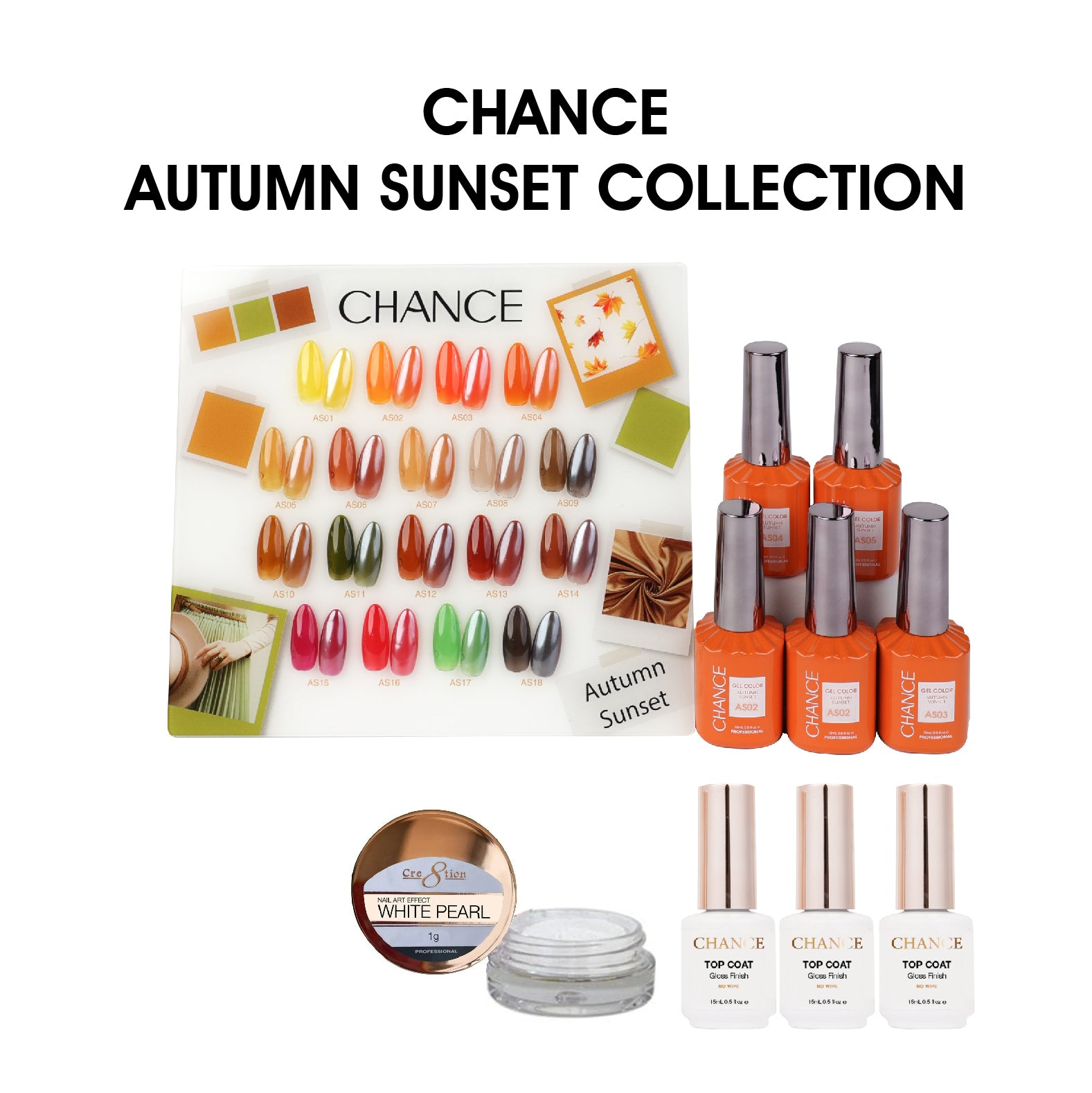 Chance Autumn Sunset Collection 0.5oz - 18 Colors w/ 1 Counter Display, 3 Chance No Wipe Top Coat 0.5oz & 1 Cre8tion Crystal Chrome Nail Art (AS01 to AS18)