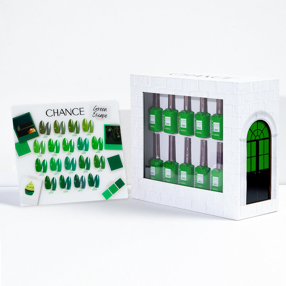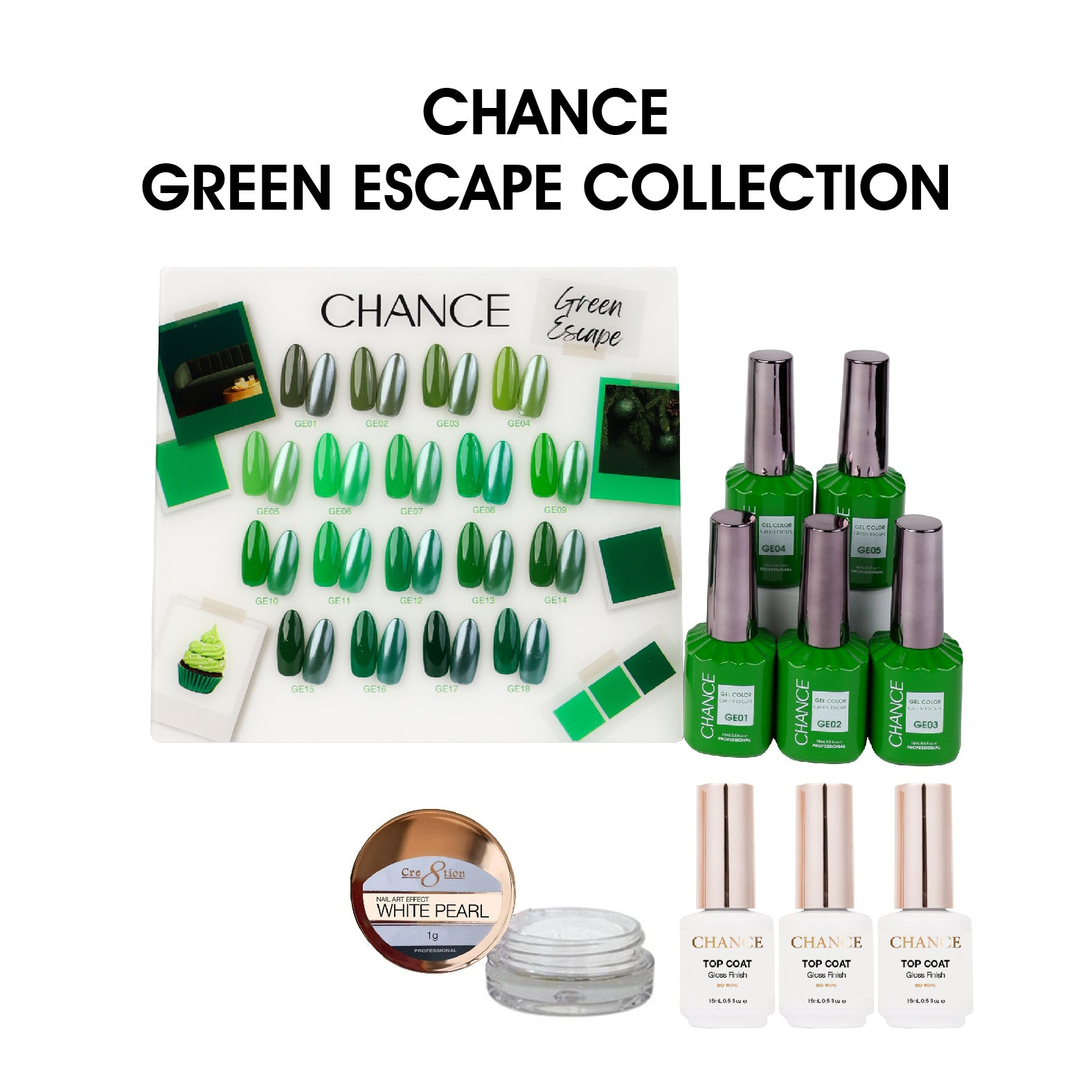 Chance Green Escape Collection 0.5oz - 18 Colors w/ 1 Counter Display, 3 Chance No Wipe Top Coat 0.5oz & 1 Cre8tion Crystal Chrome Nail Art (GE01 to GE18)