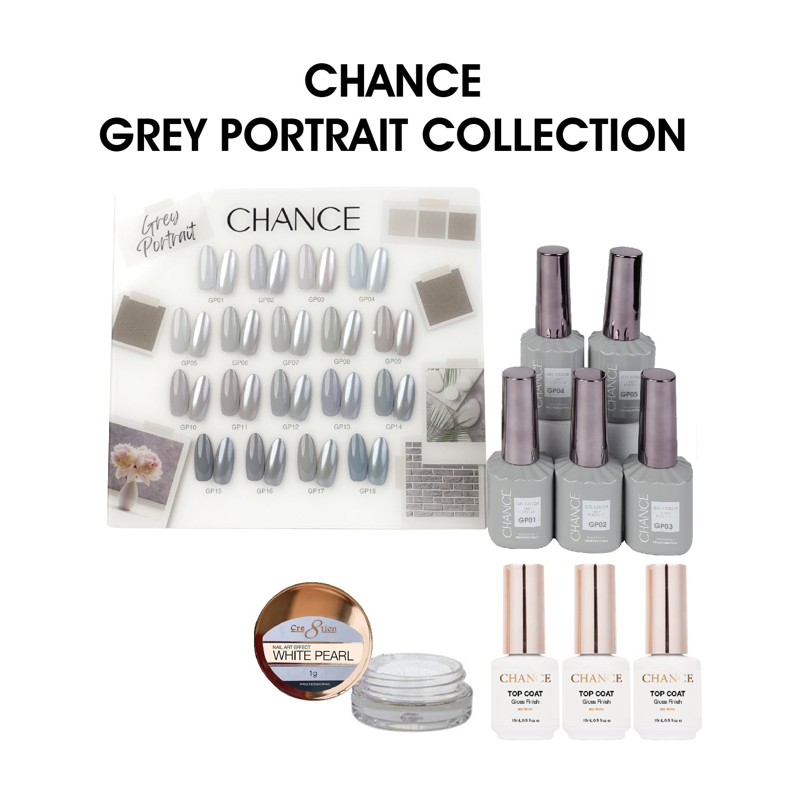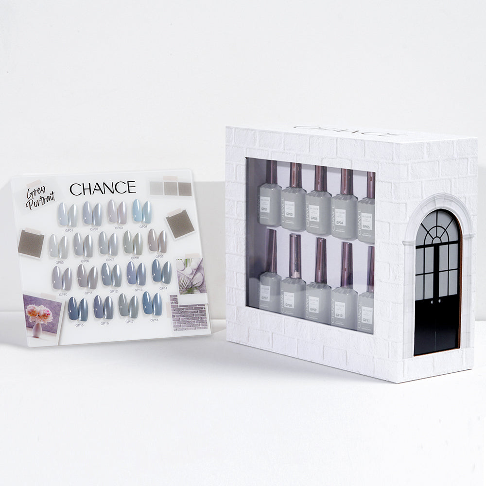 Chance Grey Portrait Collection 0.5oz - 18 Colors w/ 1 Counter Display, 3 Chance No Wipe Top Coat 0.5oz & 1 Cre8tion Crystal Chrome Nail Art (GP01 to GP18)