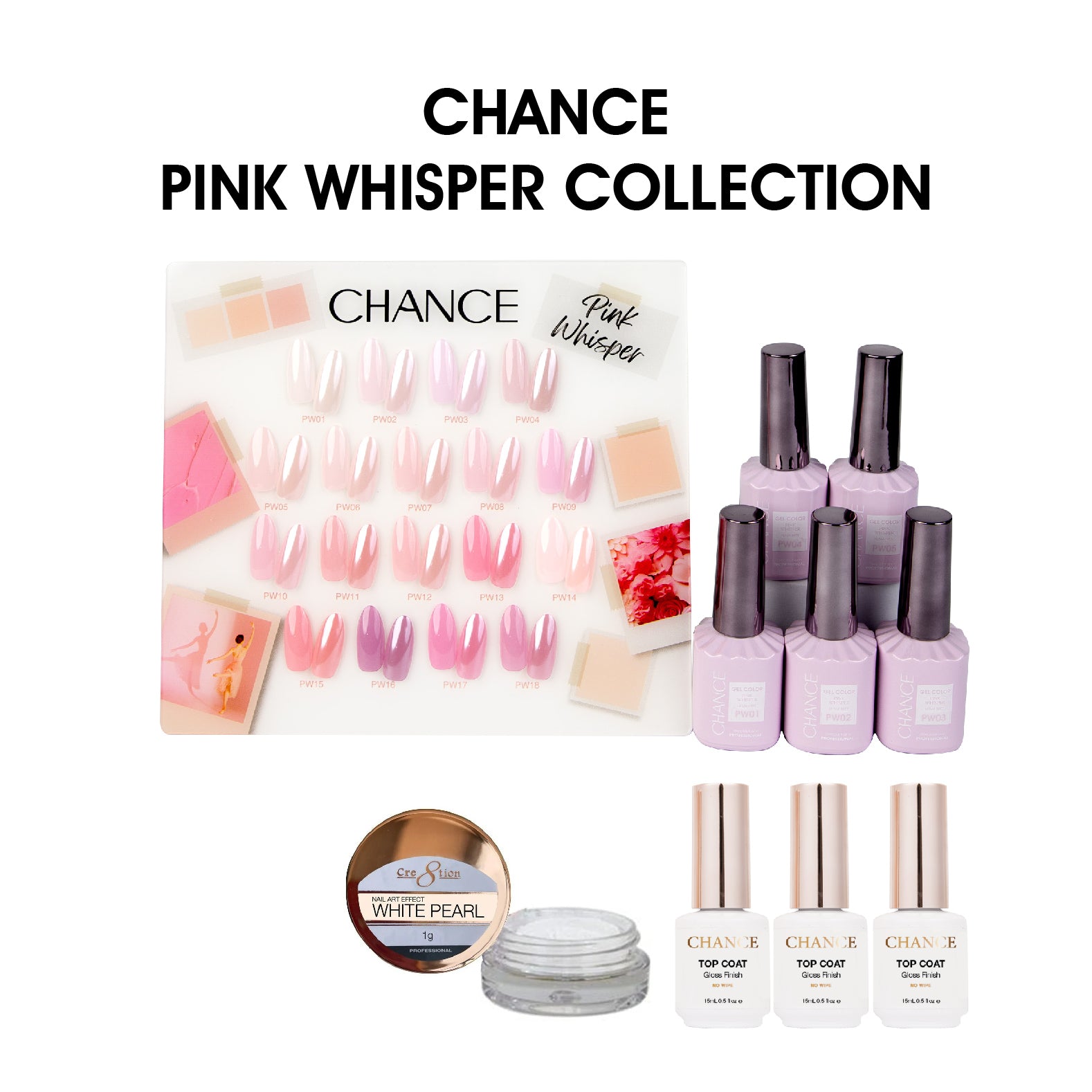 Chance Pink Whisper Collection 0.5oz - 18 Colors w/ 1 Counter Display, 3 Chance No Wipe Top Coat 0.5oz & 1 Cre8tion Crystal Chrome Nail Art (PW01 to PW18)