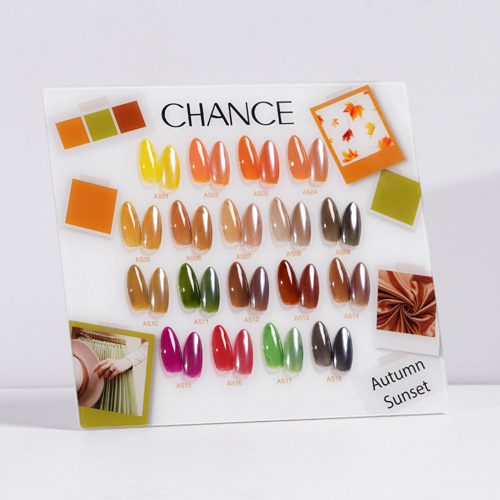 Chance Autumn Sunset Collection 0.5oz - 18 Colors w/ 1 Counter Display, 3 Chance No Wipe Top Coat 0.5oz & 1 Cre8tion Crystal Chrome Nail Art (AS01 to AS18)