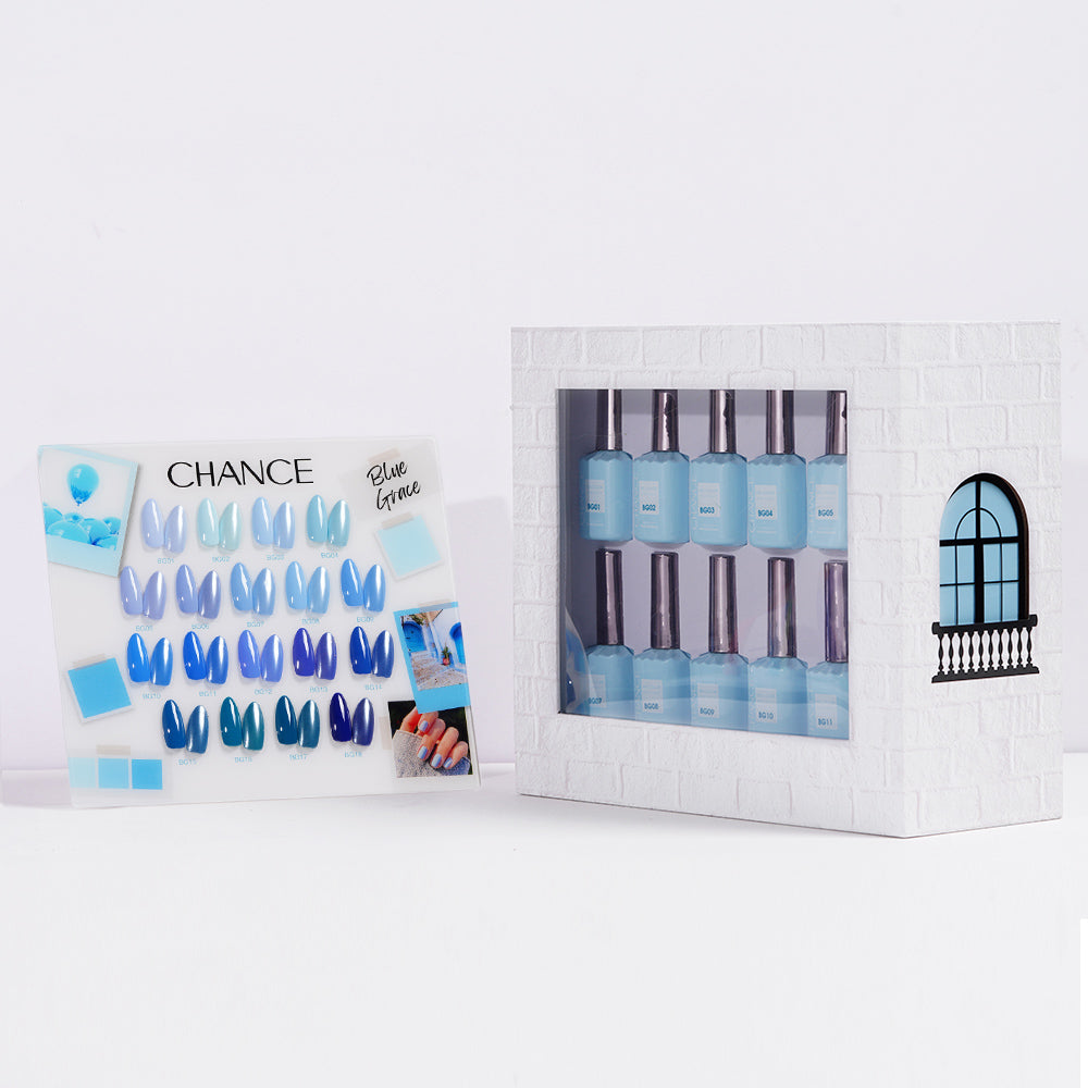 Chance Blue Grace Collection 0.5oz - 18 Colors w/ 1 Counter Display, 3 Chance No Wipe Top Coat 0.5oz & 1 Cre8tion Crystal Chrome Nail Art (BG01 to BG18)
