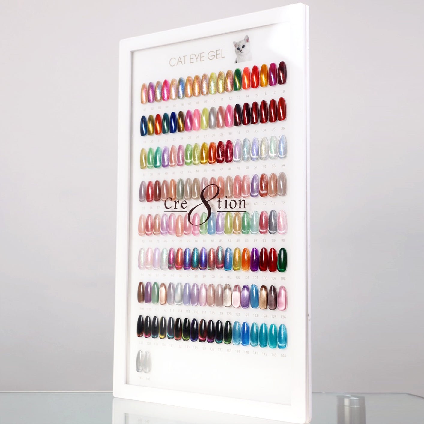 Discover the mesmerizing world of magnetic nail artistry with Cre8tion's comprehensive Cat Eye Gel collection. This professional booklet showcases 146 stunning magnetic colors that create captivating 3D effects when used with magnets. Perfect for nail artists seeking to expand their service menu with eye-catching, dimensional designs that clients will love.