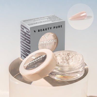 After prepping the nail, apply V Beauty Pure's Chrome Bond where you would like your chrome powder to adhere to. Cure for 30-60 seconds, depending on your lamp. Using a silicone tool, eyeshadow applicator, or your fingertip, rub the powder onto the cured nails (start with a small amount and build as needed). Wipe away any excess powder from cuticles and skin before curing with top coat. Cure under UV/LED lamp for a final time.