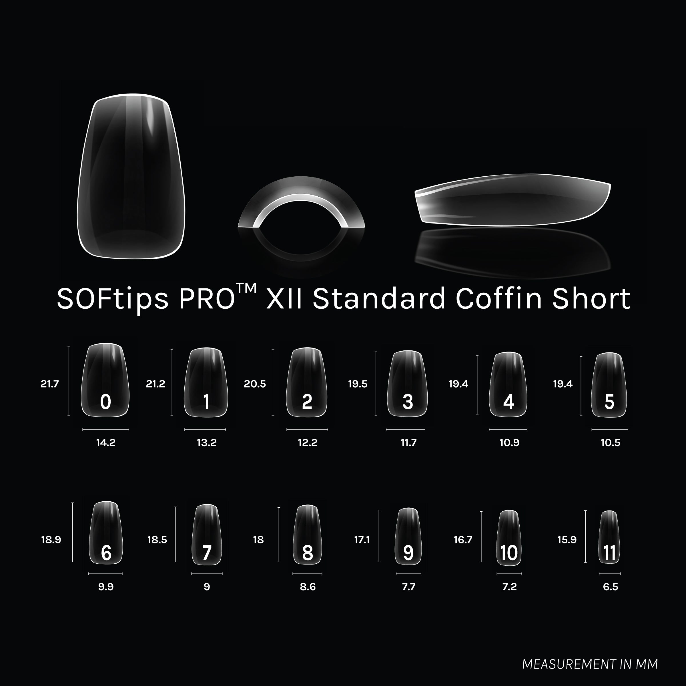 Premium quality, full coverage soft gel tips for natural & lightweight nail extensions. Explore the SOFTIPS PRO XII™ collection of Standard Style tips- pre-shaped tips featuring a thin, flexible base that can be molded to fit the unique contours of your natural nails- flat or rounded. XII tip shapes are 'natural-style' in shape- lower apex, less of a c-curve. Comes in a 12-size spread.