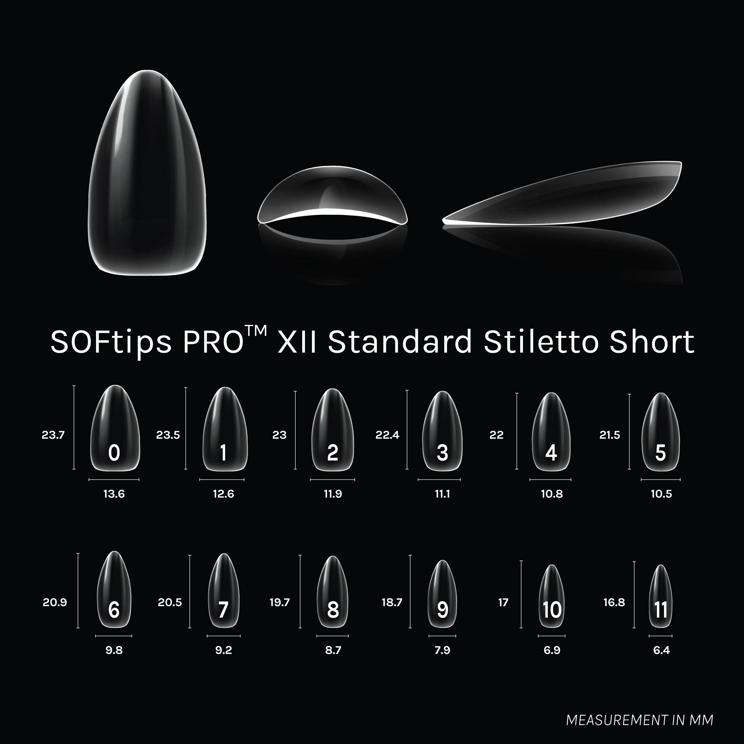 Premium quality, full coverage soft gel tips for natural & lightweight nail extensions. Explore the SOFTIPS PRO XII™ collection of Standard Style tips- pre-shaped tips featuring a thin, flexible base that can be molded to fit the unique contours of your natural nails- flat or rounded. XII tip shapes are 'natural-style' in shape- lower apex, less of a c-curve. Comes in a 12-size spread.