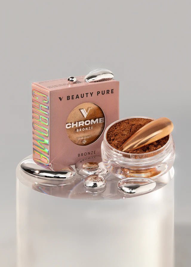 After prepping the nail, apply V Beauty Pure's Chrome Bond where you would like your chrome powder to adhere to. Cure for 30-60 seconds, depending on your lamp. Using a silicone tool, eyeshadow applicator, or your fingertip, rub the powder onto the cured nails (start with a small amount and build as needed). Wipe away any excess powder from cuticles and skin before curing with top coat. Cure under UV/LED lamp for a final time.